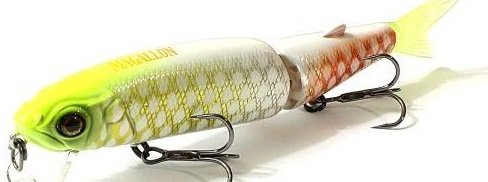 Magallon – двухсоставной воблер с оригинальным дизайном. В хвостовой части располагается мягкий, но стойкий к щучим зубам, хвостик, который при проводке дополнительно соблазняет рыбу. Даже при малой амплитуде рывков спиннинга совершает размашистые развороты и кульбиты в воде, соблазняя даже не активного хищника.