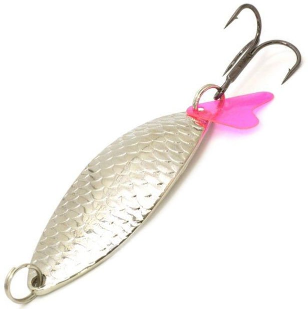 Колебалки серии Crocodile рассчитаны на ловлю довольно крупной рыбы. Масса приманки составляет 21 гр при длине в 7 см. С точки зрения условий ловли приманку можно назвать универсальной. Она проста в управлении и подойдет для начинающих рыболовов. Рифление пластины выполнено в виде чешуи рыбки. Это добавляет схожести с реальным кормовым объектом. На заводном кольце, которое соединяет тройник и блесну, есть еще один провоцирующий элемент. Это пластиковый розовый хвостик, делающий игру более активной и дразнящей. Он заставляет хищную рыбу атаковать именно там, где спрятан крючок. При проводке приманка бликует, как и чешуя настоящей рыбки. Оснащается тройным крючком, готовым к вываживанию трофея..